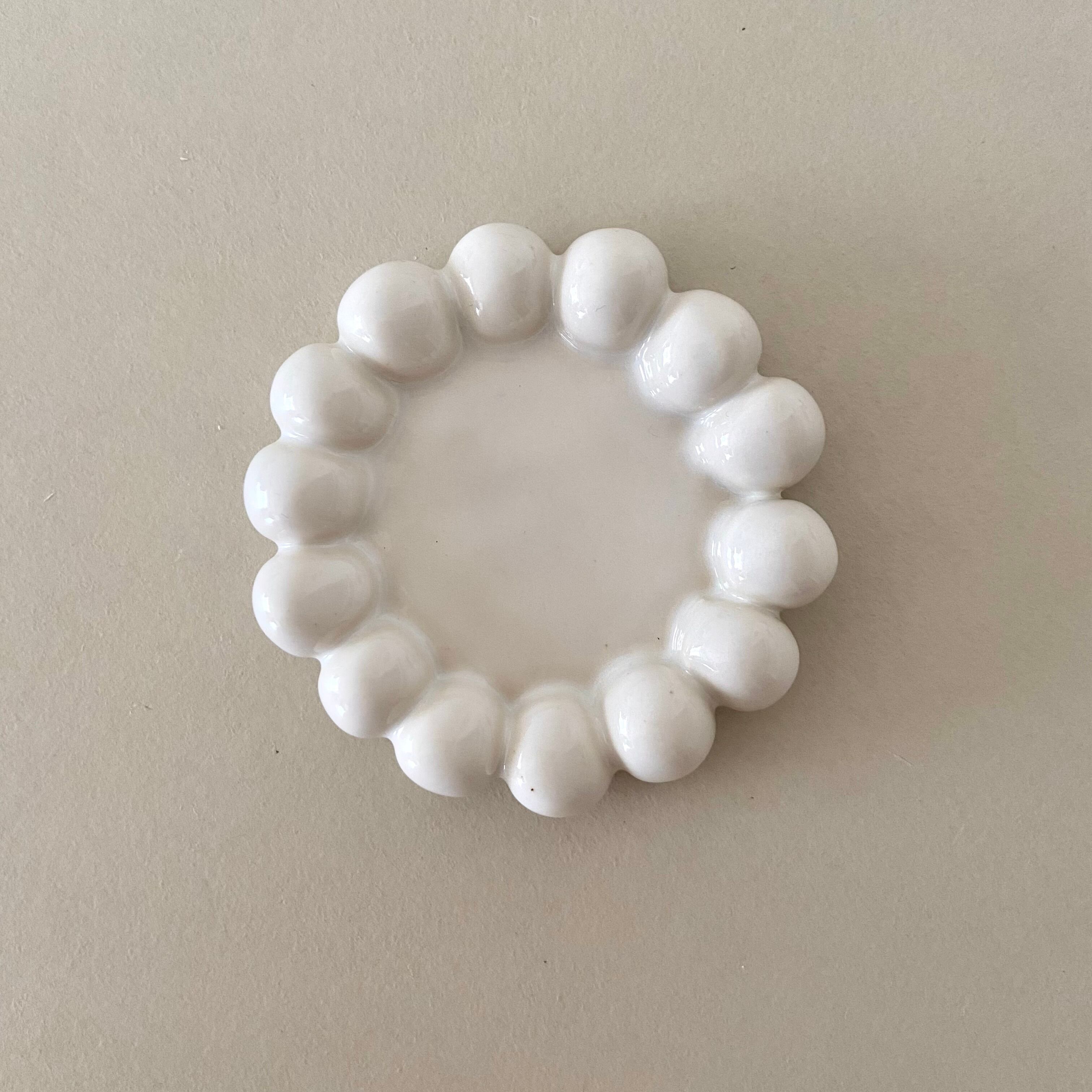 お箸置きや小さなアクセサリートレイとしても。 スプーンやフォークも安定して置いていただけます。 色味 乳白色 重さ およそ 45~55g 直径 およそ 6cm ・全て手作業のためピンホールや釉薬のむら(添付画像参照)などがある場合がございます。手づくりの作品ならではの風合いをご理解いただけますと幸いです。 ・一つ一つの色味・形に若干の個体差がある場合がございます。 ・使用後は、よく乾燥させてからご収納ください。